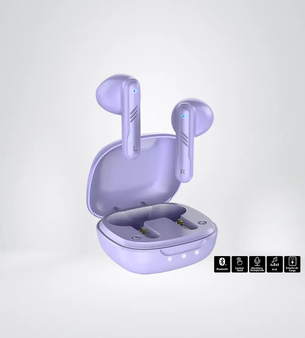 El HS-M905BT con su diseño TIPO ln-ear está diseñado conforme a la oreja humana para una comodidad prolongada durante el uso, esto le permite utilizar en cualquier momento en donde sea. TECNOLOGÍA BLUETOOTH 5.3. SONIDO Calidad HiFi con graves. Conexión rápida y estable con latencia reducida y anti interferencias mejorada, que proporciona 4 horas de reproducción continua de música y gestión de llamadas sin problemas. Disfruta de un audio enriquecido con graves de alta calidad y una experiencia de uso cómoda. ALCANCE BATERÍA Hasta 260 horas de espera. INTERFAZ DE CARGA USB tipo C. Bluetooth 5.3. Tiempo de carga del estuche de carga Hasta 1 ~ 2 horas. ALCANCE INALÁMBRICO Hasta 10 metros.