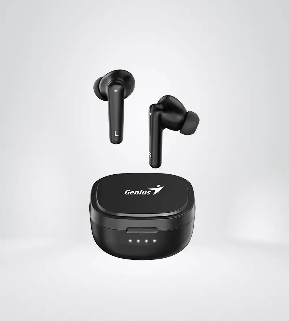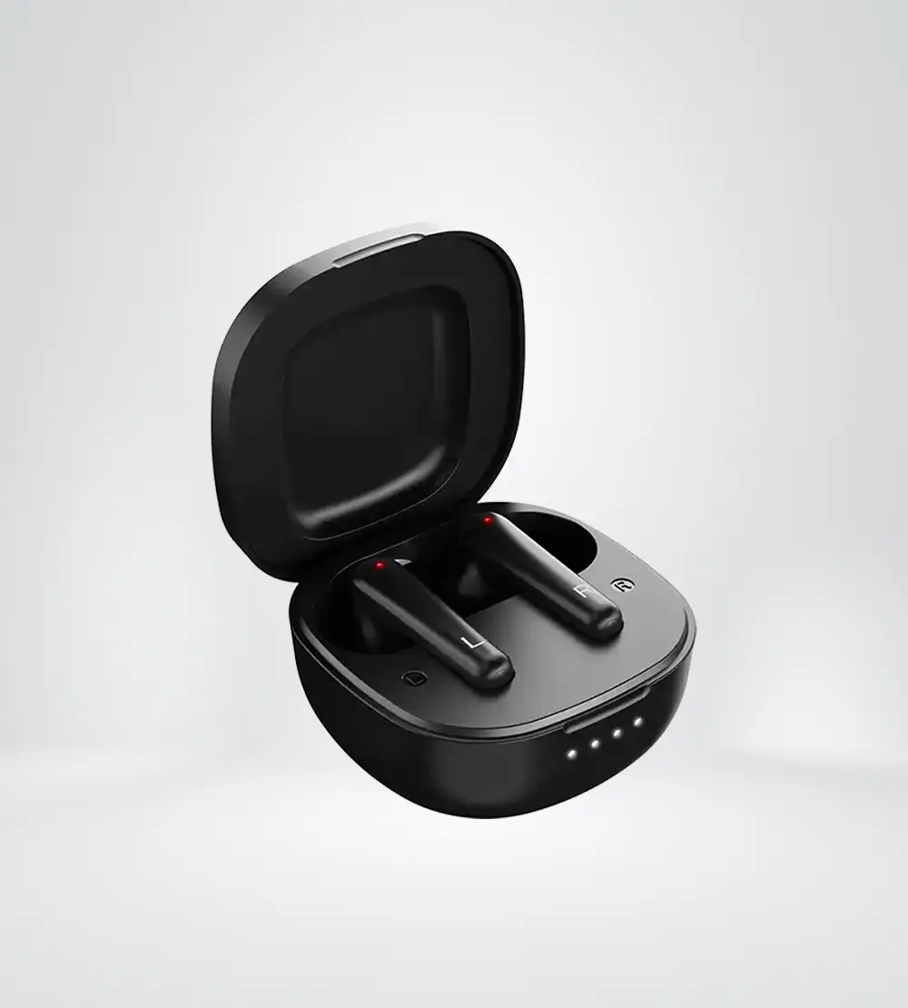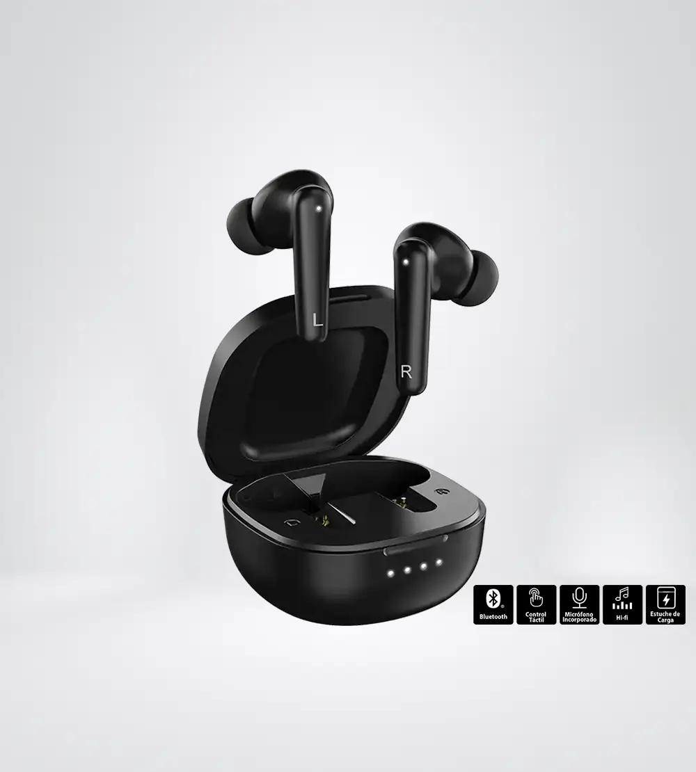 CONTROL CON TACTO INTELIGENTE consiste en 2 partes: un set de auricular y un estuche compacto para cargar. REDUCCIÓN DE RUIDO provee alta calidad de sonido con bajo, a la vez brinda reducción de sonido. Utiliza la tecnología Bluetooth que permite conectar inalámbricamente a los dispositivos móviles para escuchar música o llamadas. CONEXIÓN Tipo C de carga rápida. TIEMPO DE ESPERA Batería de larga vida para 300 horas en modo espera. TIEMPO DE REPRODUCCIÓN de música de hasta 4 horas.