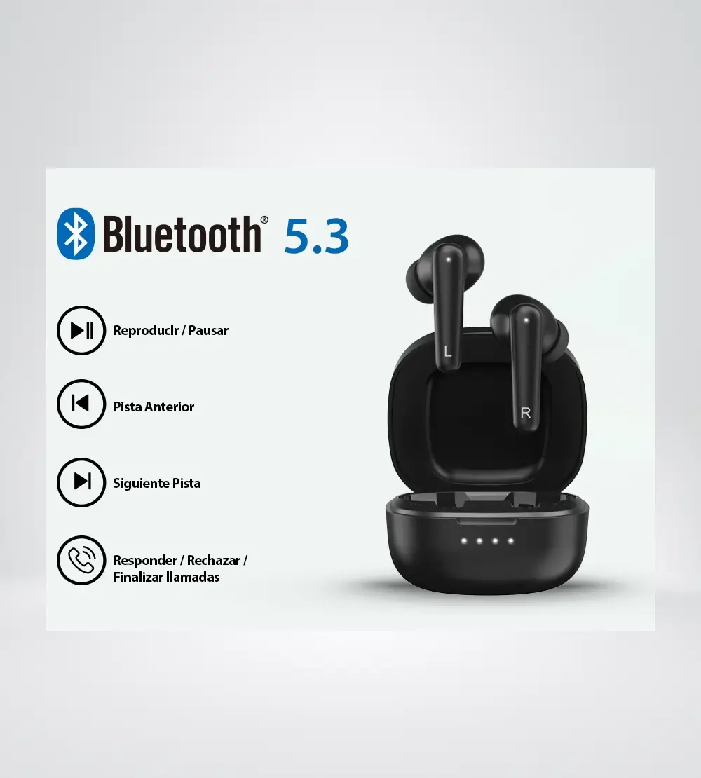CONECTIVIDAD Bluetooth 5.3. BATERÍA DEL ESTUCHE DE CARGA 3,7 V / 300 mAh. BATERÍA DE AURICULARES 3,7 V / 40 mAh. TIEMPO DE JUEGO / CELULAR Hasta 4 horas. TIEMPO DE ESPERA Hasta 300 horas. RADIO DE ACCIÓN Hasta 10 metros. PESO Aprox. Auriculares: 8 g / Estuche de carga: 34 g. DIMENSIONES Auriculares: 21 x 35,8 x 23,7 mm. Estuche de carga: 54,2 x 54,1 x 29,8 mm. DISPOSITIVOS COMPATIBLES Computadoras o laptops / Tabletas o teléfonos inteligentes / Reproductores de MP3.