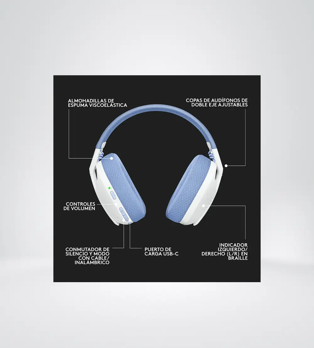 PESO 165 gramos. DIMENSIONES 163 × 170 × 71 mm. CONTROLADORES DE AUDIO 40 mm. RESPUESTA DE FRECUENCIA 20 Hz - 20 KHz. IMPEDANCIA 45 ohmios (pasiva). SENSIBILIDAD 83,1 dB SPL / mW. VOLUMEN MÁXIMO <100 dB con limitador opcional a <85 dB. RESPUESTA DE FRECUENCIA 100 Hz - 8 KHz. GAMA INALÁMBRICA Hasta 10 metros (33 pies) a través del receptor USB LIGHTSPEED o Bluetooth. TIEMPO DE JUEGO 18 horas. PUERTO DE CARGA USB-C. CABLE DE CARGA USB-A a USB-C.