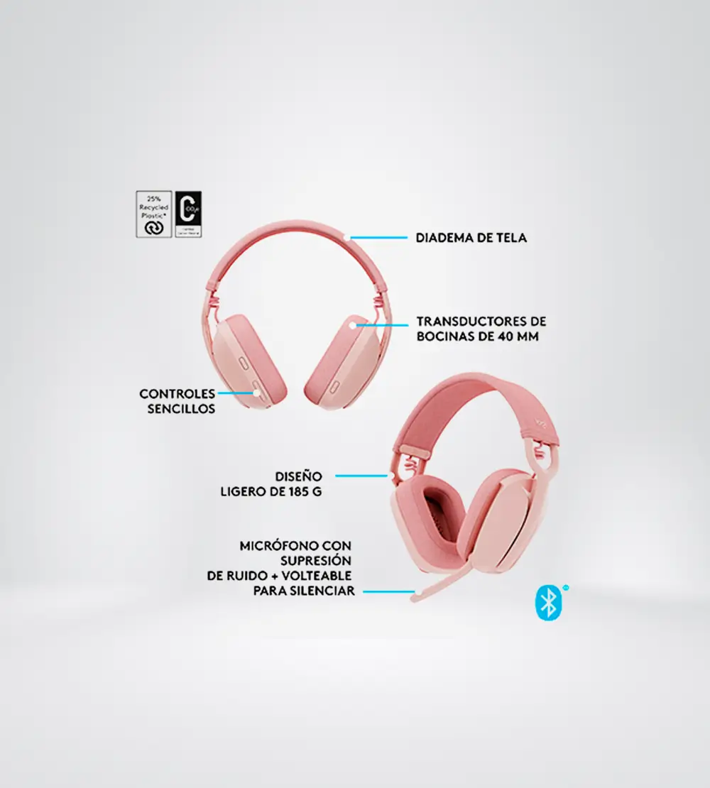 ENCUENTRA TU PROPIO CAMINO ¿Por qué conformarse con lo aburrido? Expresa tu sentido del estilo único con los auriculares inalámbricos Zone Vibe 100. Compatibles con las plataformas de reuniones por video comunes que usas todos los días. Audio excepcional para el tiempo de actividad y de inactividad. DISEÑADOS PARA MOMENTOS DE TRABAJO Y DE OCIO te permite ser tú mismo en el trabajo y en casa. Voltea la varilla del micrófono hacia abajo para hablar de negocios, retírala para ver películas y escuchar música. REUNIONES DE VIDEO SENCILLAS DESDE CASA La compatibilidad con las plataformas populares de reuniones y llamadas facilita la incorporación en cualquier reunión. Un micrófono con cancelación de ruido que se voltea para silenciar minimiza los sonidos de fondo para que te puedan escuchar con claridad. DISFRUTA DEL AUDIO ENVOLVENTE Sumérgete en el placer que produce el sonido de los altavoces de 40 mm, que transmiten un audio pleno y enriquecido. LOGRA LA LIBERTAD INALÁMBRICA SIN RESTRICCIONES Muévete libremente por tu oficina o por tu hogar y mantén la conexión con Bluetooth® multipunto. Obtén hasta 20 horas de tiempo de escucha y 18 horas de tiempo de conversación con una carga completa. ¿Carga de batería baja? Conéctalos durante 5 minutos para obtener hasta una hora de tiempo de escucha. CONTROLES SENCILLOS AL ALCANCE DE TU MANO ubicados de forma conveniente en ambos lados del auricular.
