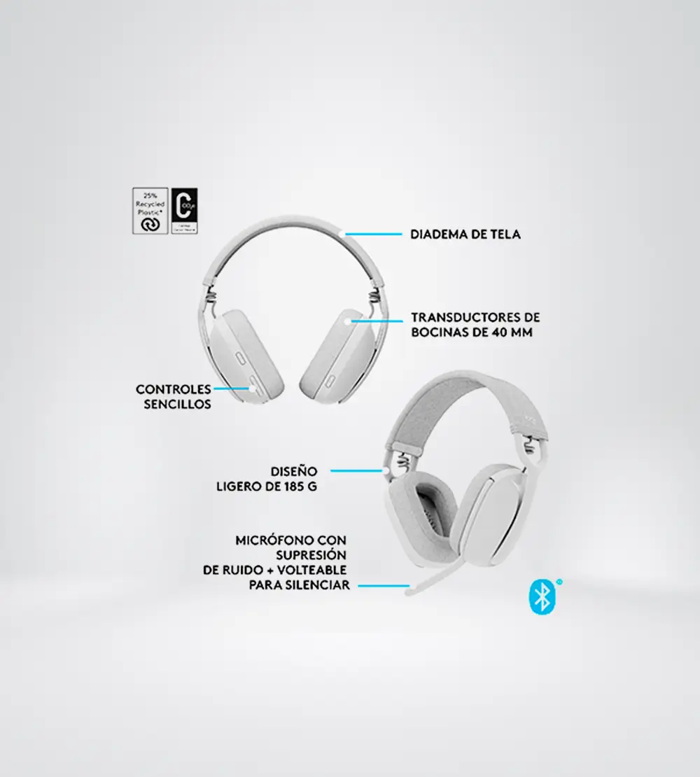 ENCUENTRA TU PROPIO CAMINO ¿Por qué conformarse con lo aburrido? Expresa tu sentido del estilo único con los auriculares inalámbricos Zone Vibe 100. Compatibles con las plataformas de reuniones por video comunes que usas todos los días. Audio excepcional para el tiempo de actividad y de inactividad. DISEÑADOS PARA MOMENTOS DE TRABAJO Y DE OCIO te permite ser tú mismo en el trabajo y en casa. Voltea la varilla del micrófono hacia abajo para hablar de negocios, retírala para ver películas y escuchar música. REUNIONES DE VIDEO SENCILLAS DESDE CASA La compatibilidad con las plataformas populares de reuniones y llamadas facilita la incorporación en cualquier reunión. Un micrófono con cancelación de ruido que se voltea para silenciar minimiza los sonidos de fondo para que te puedan escuchar con claridad. DISFRUTA DEL AUDIO ENVOLVENTE Sumérgete en el placer que produce el sonido de los altavoces de 40 mm, que transmiten un audio pleno y enriquecido. LOGRA LA LIBERTAD INALÁMBRICA SIN RESTRICCIONES Muévete libremente por tu oficina o por tu hogar y mantén la conexión con Bluetooth® multipunto. Obtén hasta 20 horas de tiempo de escucha y 18 horas de tiempo de conversación con una carga completa. ¿Carga de batería baja? Conéctalos durante 5 minutos para obtener hasta una hora de tiempo de escucha. CONTROLES SENCILLOS AL ALCANCE DE TU MANO ubicados de forma conveniente en ambos lados del auricular.