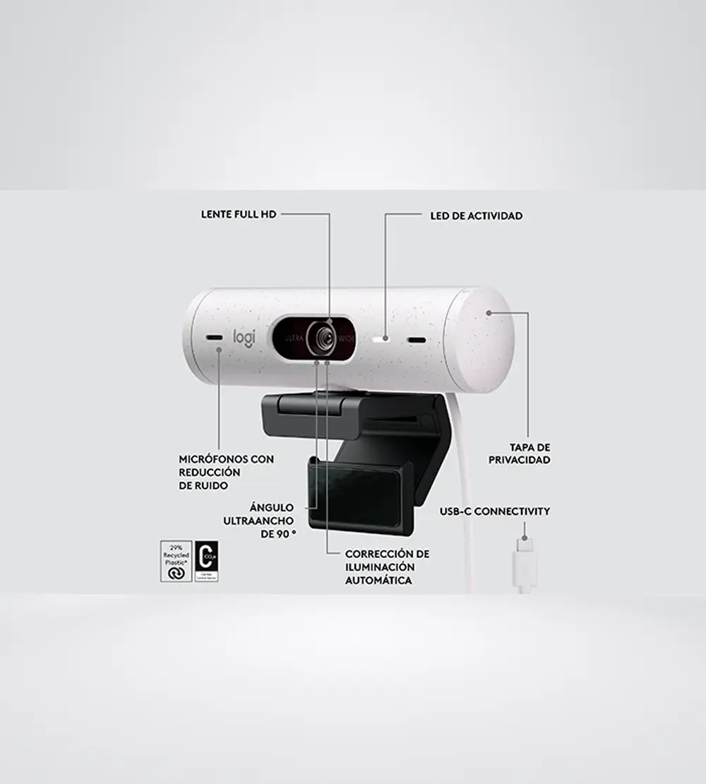 CORRECCIÓN AUTOMÁTICA DE LUZ Siéntete seguro en cada reunión híbrida con una cámara web que aporta personalidad y facilidad a la configuración de tu oficina. Corrección automática de la iluminación y los micrófonos con reducción de ruido aseguran que te veas y suenes claro y natural en cada reunión. AUDIO Asegúrate de que tus colegas escuchen lo que tienes que decir, incluso cuando no cuentes con auriculares ni audífonos. Los micrófonos con reducción de ruido filtran el sonido de fondo y mejoran tu voz para que te escuchen con claridad a ti y no al ruido que te rodea. MODO MOSTRAR para inclinar la cámara hacia abajo y presentar bocetos, trabajos en curso y otros objetos de tu escritorio. Pieza de montaje incluida cuenta con una microventosa que asegura la cámara web a la parte posterior de tu monitor. Descarga Logi Tune de forma gratuita para habilitar el Modo Mostrar. PLATAFORMAS DE REUNIONES Únete fácilmente a una reunión usando tu aplicación de videoconferencia preferida. Compatible con la mayoría de las plataformas de reuniones y aplicaciones de llamadas y cuenta con certificación para el uso con Microsoft Teams, Google Meet y Zoom. PRIVACIDAD Gira la tapa de privacidad integrada para bloquear completamente la cámara cuando no quieres que te vean. Diseñada para proteger tu privacidad.