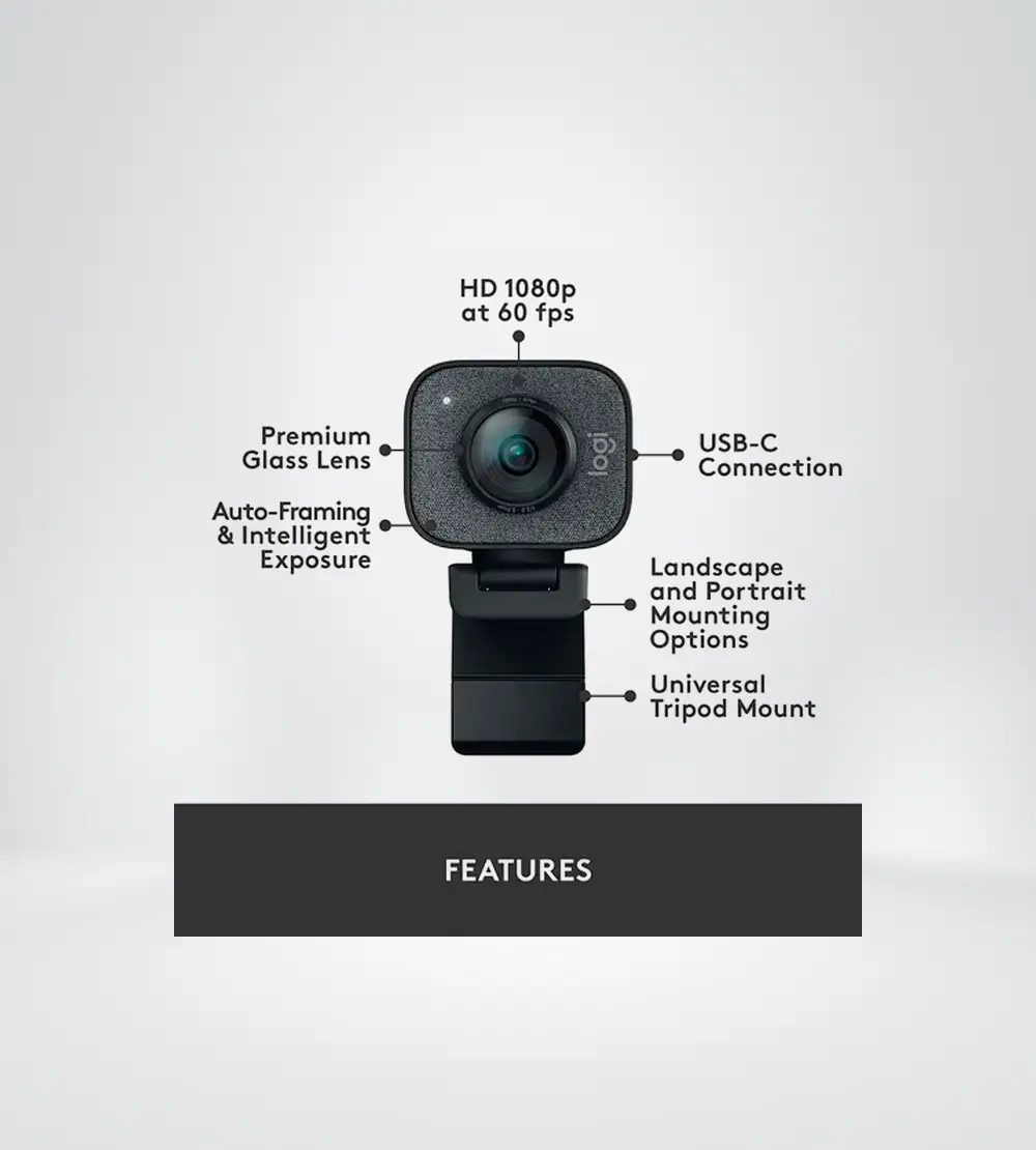 Logitech StreamCam hace streaming y graba con resolución Full HD 1080p a 60 fps, ofreciendo excepcional video con movimiento fluido para tu mundo online. FULL HD 1080P A 60 FPS Haz streaming y graba videos para YouTube, Twitch, etc. con resolución Full HD 1080p a 60 fotogramas por segundo. Sea cual sea el tipo de contenido que crees, StreamCam produce imágenes nítidas, fluidas y totalmente naturales en pantalla. LENTE DE CRISTAL PREMIUM CON ENFOQUE AUTOMÁTICO INTELIGENTE produce una calidad de imagen vibrante y fidedigna, con claros detalles. Un campo visual de 78 grados te mantiene como centro de atención en la imagen. ENCUADRE AUTOMÁTICO Y EXPOSICIÓN INTELIGENTE ajusta de forma dinámica el encuadre para mantener tu imagen en el centro de la toma, aunque te muevas hacia los lados. OPTIMIZACIÓN PARA SOFTWARE DE STREAMING DE VIDEO EN TIEMPO REAL. CONTROL MEJORADO CON EL SOFTWARE LOGITECH CAPTURE ¿Quieres subir el nivel de tu contenido? Combina StreamCam con el software Logitech Capture incluido para aprovechar eficaces funciones con las que automatizar el enfoque y la exposición, y más. SE CONECTA CON USB-C.