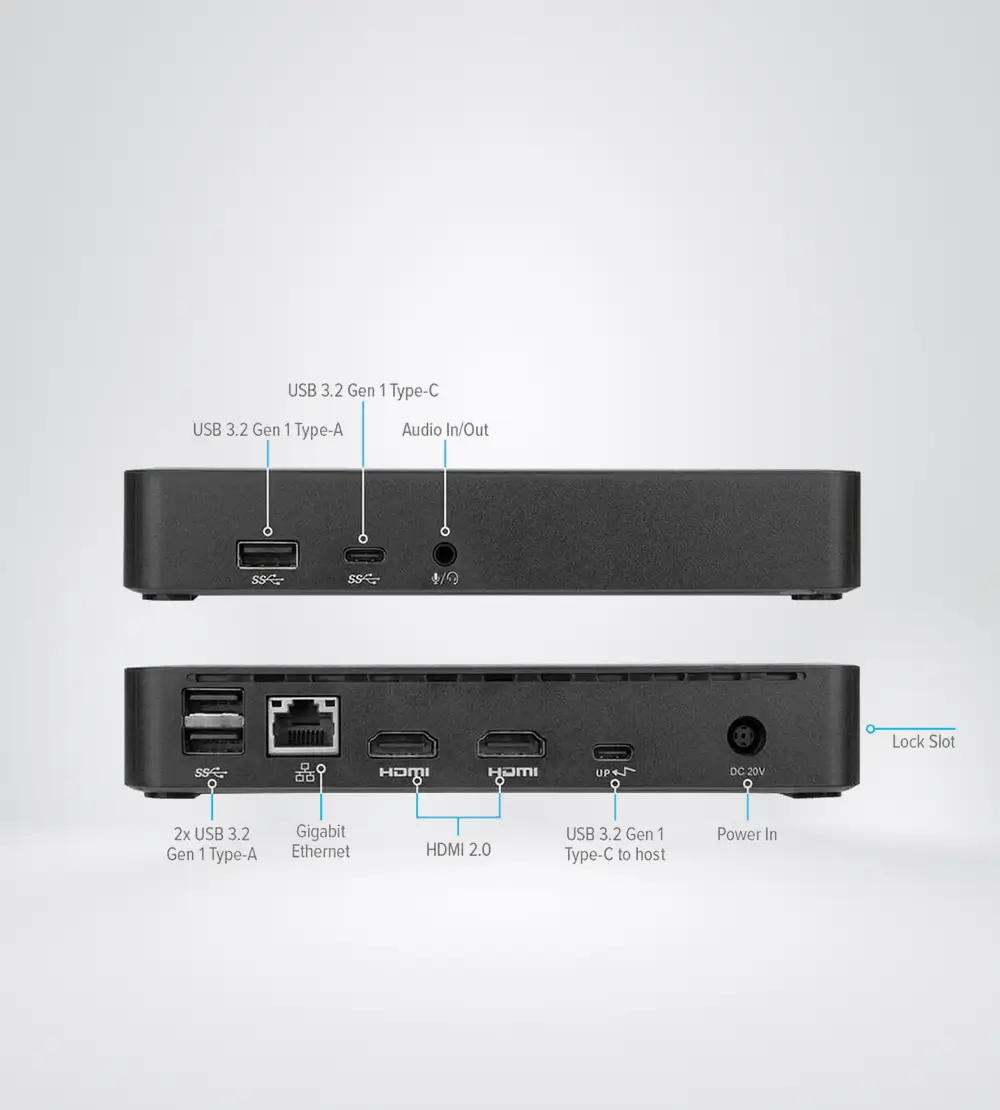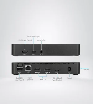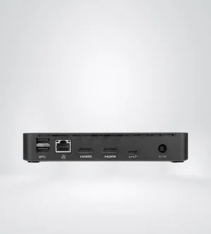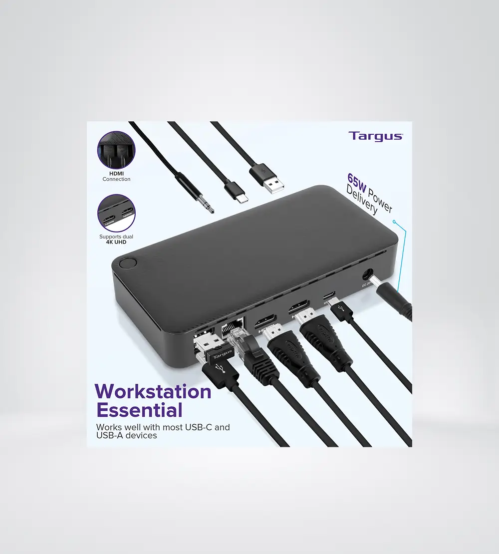 Admite video único 5K y dual 4K UHD a 60 Hz a través de dos puertos HDMI 2.0 que crean una experiencia de visualización rica y de ultra alta definición. Tres puertos USB 3.2 Gen 1 tipo A y 1 puerto USB 3.2 Gen 1 tipo C simplifican la adición de los últimos teclados, discos duros exteriores y otros periféricos para personalizar la experiencia del espacio de trabajo. Compacta y elegante, esta base es ideal para escritorios pequeños y espacios reducidos. La base también está equipada con una disposición de montaje de soporte VESA, que permite el uso del soporte de montaje VESA de Targus (ACX003GLZ, se vende por separado) para sostener la base detrás de la pantalla para ahorrar aún más espacio. Suite de software empresarial: una exclusiva de Targus Mejore la seguridad y mejore la experiencia del usuario con Targus Enterprise Software Suite para DOCK310USZ. Cambio automático de Wi-Fi: habilita/deshabilita automáticamente la funcionalidad de Wi-Fi cuando la conexión Ethernet de la base está activa, lo que reduce el tráfico de red innecesario y permite velocidades de conexión más rápidas.
