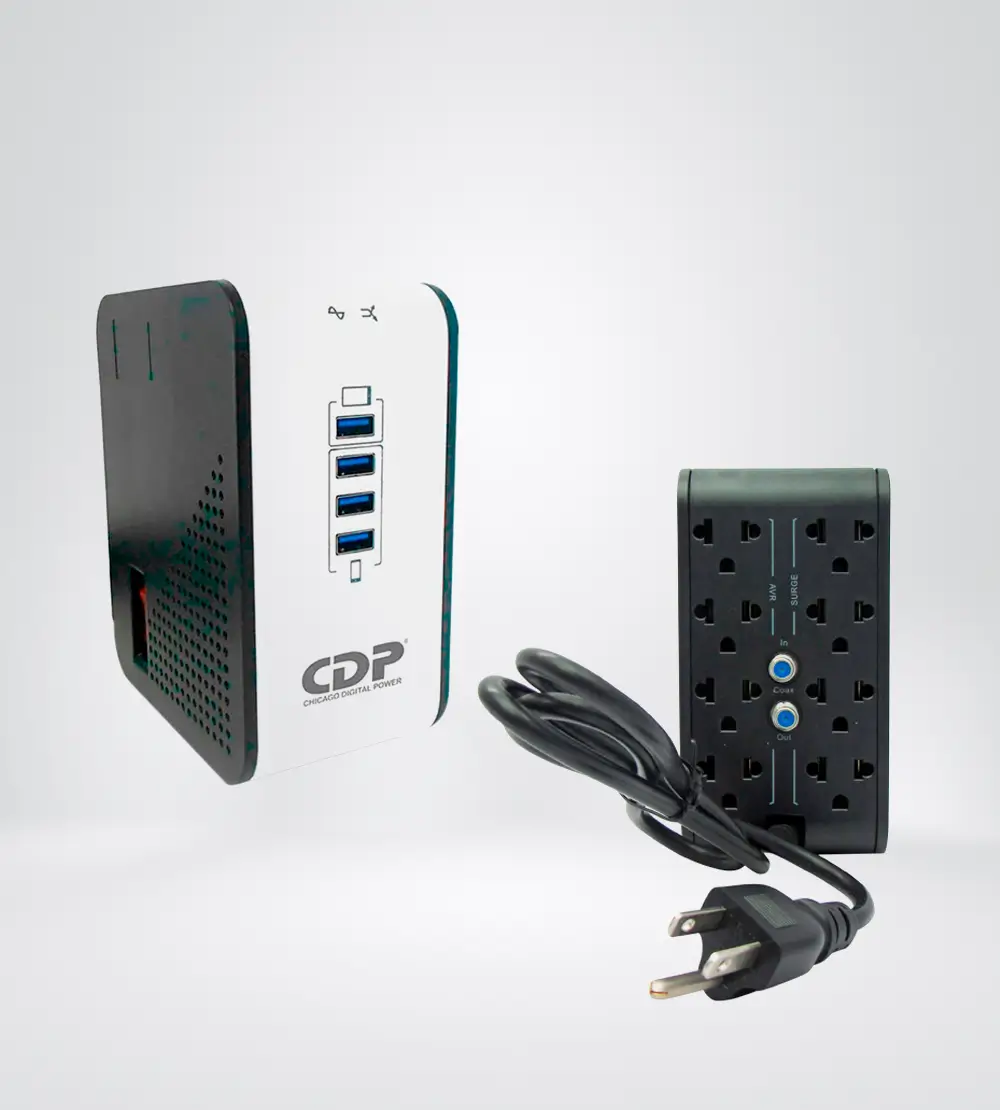 Regulador de voltaje automático de 1000 VA con protección contra sobre tensiones y cargador USB de 4 puertos y 8 toma corrientes regulados NEMA 5-15 montados en la parte posterior y 4 solo contra sobre tensiones. Mini indicadores LED para potencia y calidad de voltaje de entrada. Disyuntor de sobrecarga combinado de encendido / apagado para proteger la carga y plástico que cumple con UL anti flama para su seguridad.