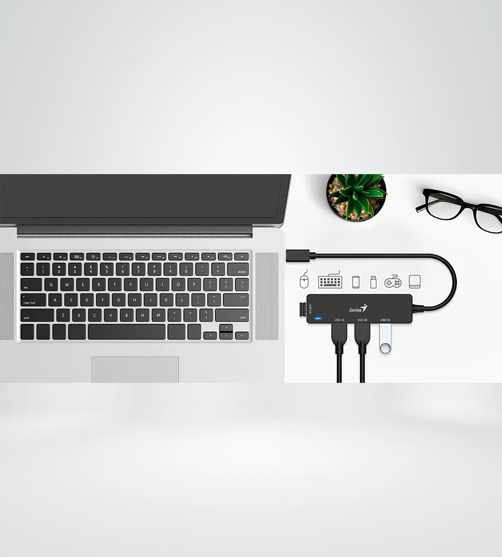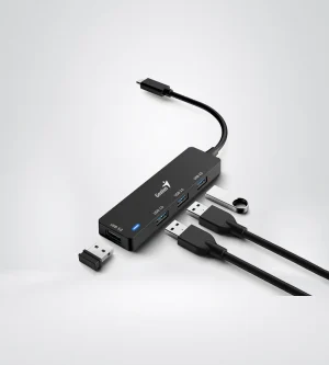 Hub USB-C Genius de 4 puertos, 4 puertos USB 3.0 tipo A (F), instalación Plug and Play. Genius UH-400 ofrece 4 puertos USB 3.0 para ordenadores mediante conector USB tipo C. Puede utilizar estos puertos adicionales para transmitir datos o conectar dispositivos USB incluso si su computadora no tiene suficientes puertos USB.
