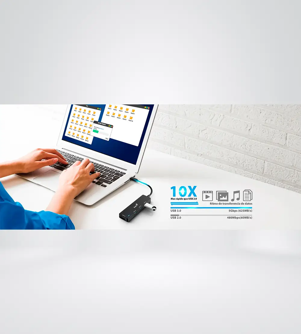 FUNCIÓN Hub USB 3.0 de 4 puertos para transmisión de datos o conexión de dispositivos USB. COMPATIBILIDAD Los 4 puertos admiten USB 3.0. TRÁNSMISIÓN DE DATOS de hasta 5 Gbps (625 MB/s), 10 veces más rápido que USB 2.0. INTERFAZ USB 3.0. LONGITUD DEL CABLE 15 cm. PESO 38 g. COLOR Negro.