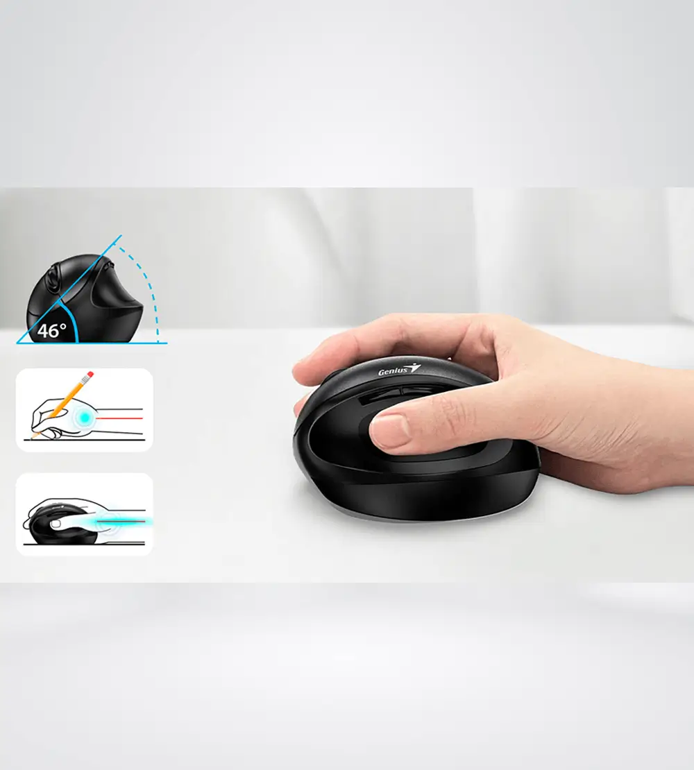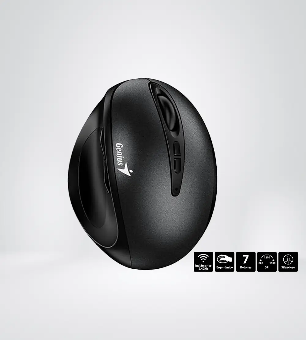 Postura naturalmente ergonómica, mouse inalámbrico vertical. DISEÑO vertical con inclinación de 46° para una postura natural y ergonómica con reposa pulgar. ERGONOMÍA Ayuda a reducir el estrés y tensión muscular durante las horas de trabajo. BOTONES 7 Botones que le permite adelantar, retroceder y subir y bajar el DPI. INTERRUPTOR SILENCIOSO El Ergo 8300S cuenta con un diseño de interruptor silencioso que minimiza el ruido de los clics, lo que le permite completar tareas de manera efectiva sin molestar a los demás y le permite disfrutar de su trabajo en cualquier momento y en cualquier lugar.