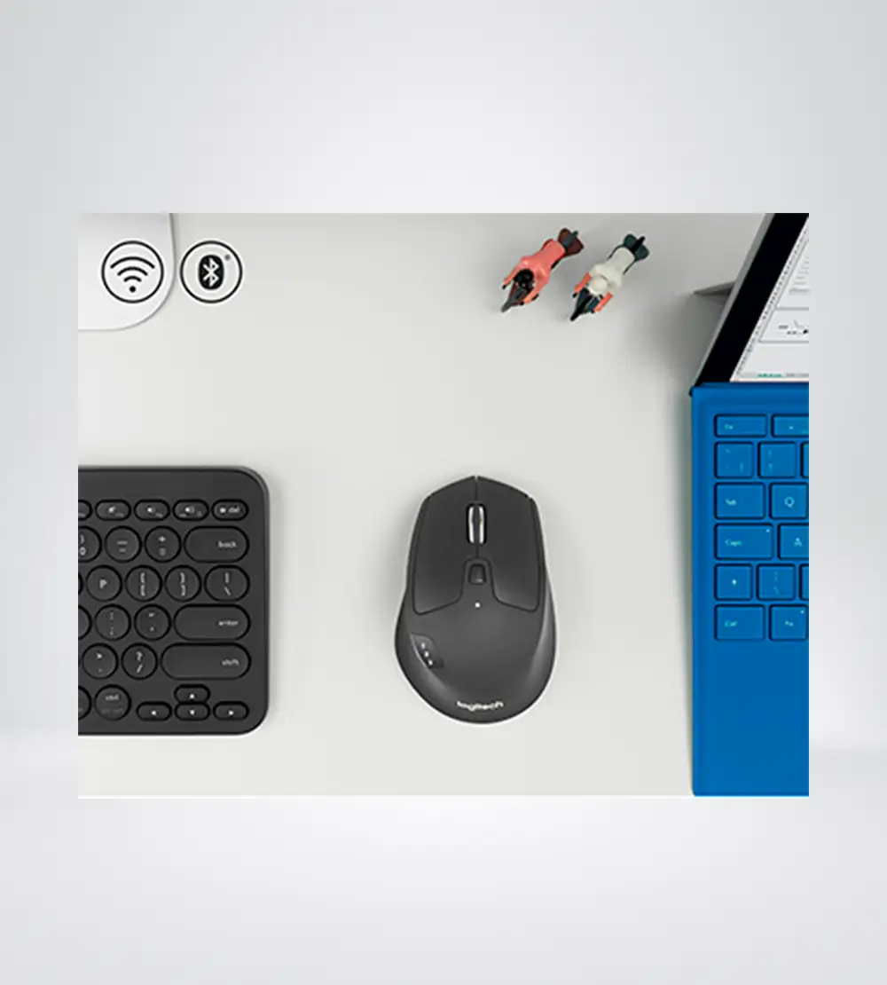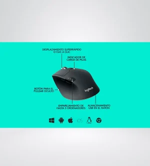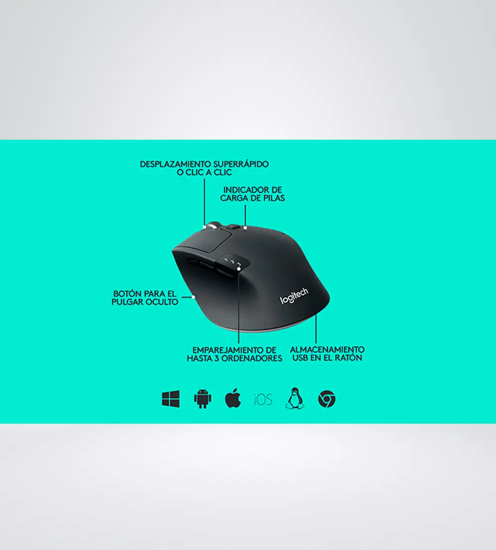 TECNOLOGÍA EASY-SWITCH Empareja tu ratón con tres ordenadores, luego alterna fácilmente entre ellos con sólo pulsar un botón prácticamente colocado bajo el pulgar. Los tres números iluminados te permiten saber en todo momento a qué dispositivo estás conectado. DESPLAZAMIENTO SUPERRÁPIDO Recorre rápidamente documentos y páginas Web largos con un solo giro del botón rueda, que puedes detener al instante, o cambia al modo clic a clic cuando necesites precisión. DURADERO Y CONTORNEADO diseñado para durar, con botones que resisten hasta 10 millones de clics. El diseño de tamaño grande para la mano derecha se ajusta cómodamente a la palma de la mano, y la superficie de goma lo hace especialmente suave al tacto. DURACIÓN DE PILAS DE 24 MESES Con su conmutador de encendido/apagado puede prolongar aún más la duración, y el indicador avisa cuando la pila se está agotando. PRODUCTIVIDAD PERSONALIZADA Descarga el software Logitech Options™ para disfrutar de todas las posibilidades y adaptarlo a tus requisitos en Mac® OS X y Windows®. Configura y asigna tareas a los botones con instrucciones paso a paso.