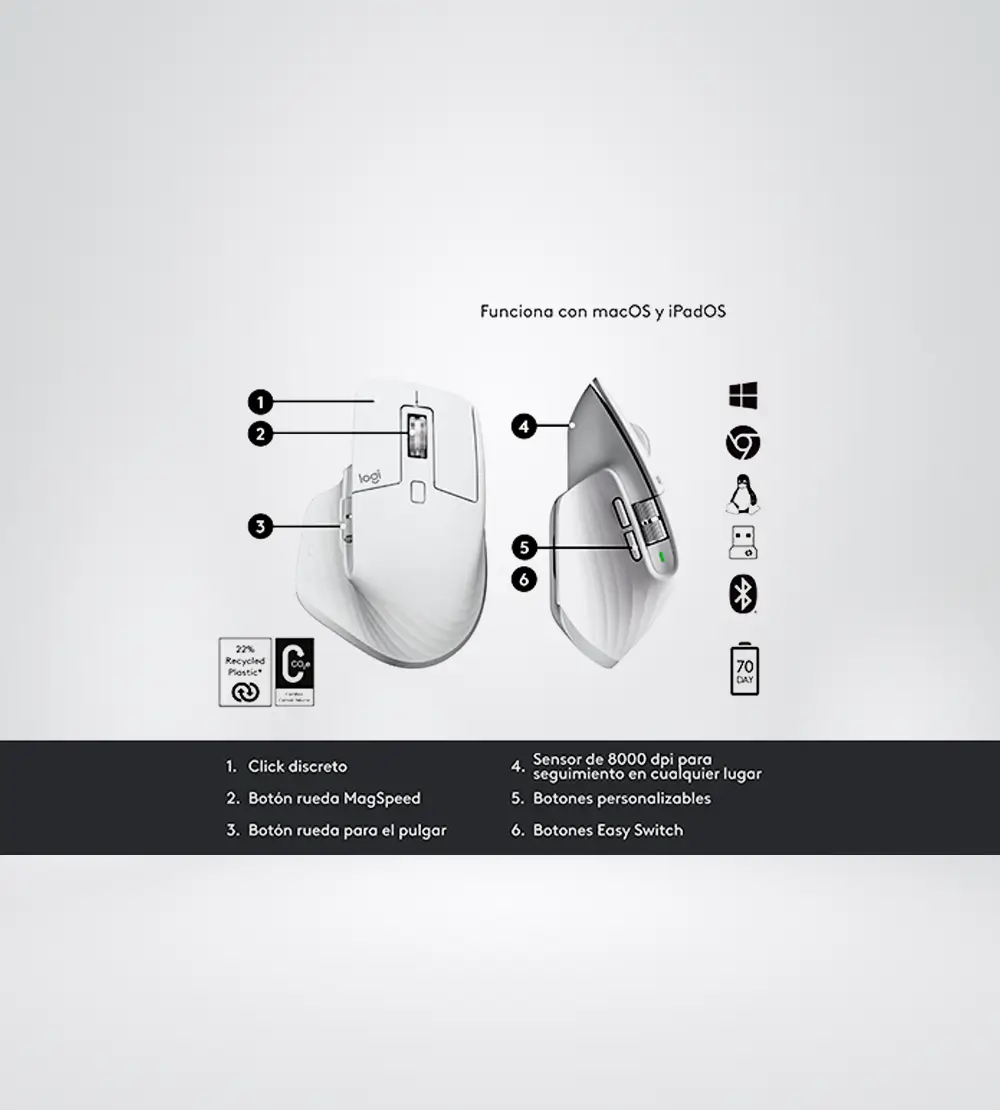 UN CLÁSICO. REMASTERIZADO Siente cada momento de tu flujo de trabajo con más precisión, sensación táctil y desempeño, gracias a los clicks discretos y un sensor de seguimiento sobre cristal de 8.000 dpi. SIÉNTELO – SIN APENAS OÍRLO Con clicks discretos: crea y haz todo tipo de cosas con la misma sensación de click, pero con menos ruido. Los clicks discretos ofrecen una sensación táctil satisfactoria y producen un 90% menos de ruido. SEGUIMIENTO DE 8000 DPI EN CUALQUIER SUPERFICIE equipado con nuestro sensor más preciso hasta la fecha, con precisión y capacidad de respuesta de próxima generación. DESPLAZAMIENTO A 1000 LÍNEAS POR SEGUNDO es suficientemente preciso como para detenerse en un píxel y suficientemente rápido como para desplazarse por 1.000 líneas por segundo. Y es prácticamente silencioso. CARGA RÁPIDA, CONEXIÓN INSTANTÁNEA funciona hasta 70 días con una carga completa, y permite tres horas de uso con un minuto de carga rápida. ADAPTADO A LA MANO, PARA CONFORT PROLONGADO Trabaja confortablemente con una silueta ergonómica diseñada para soportar la palma y los dedos. Las superficies texturizadas proporcionan un agarre seguro para un control total.
