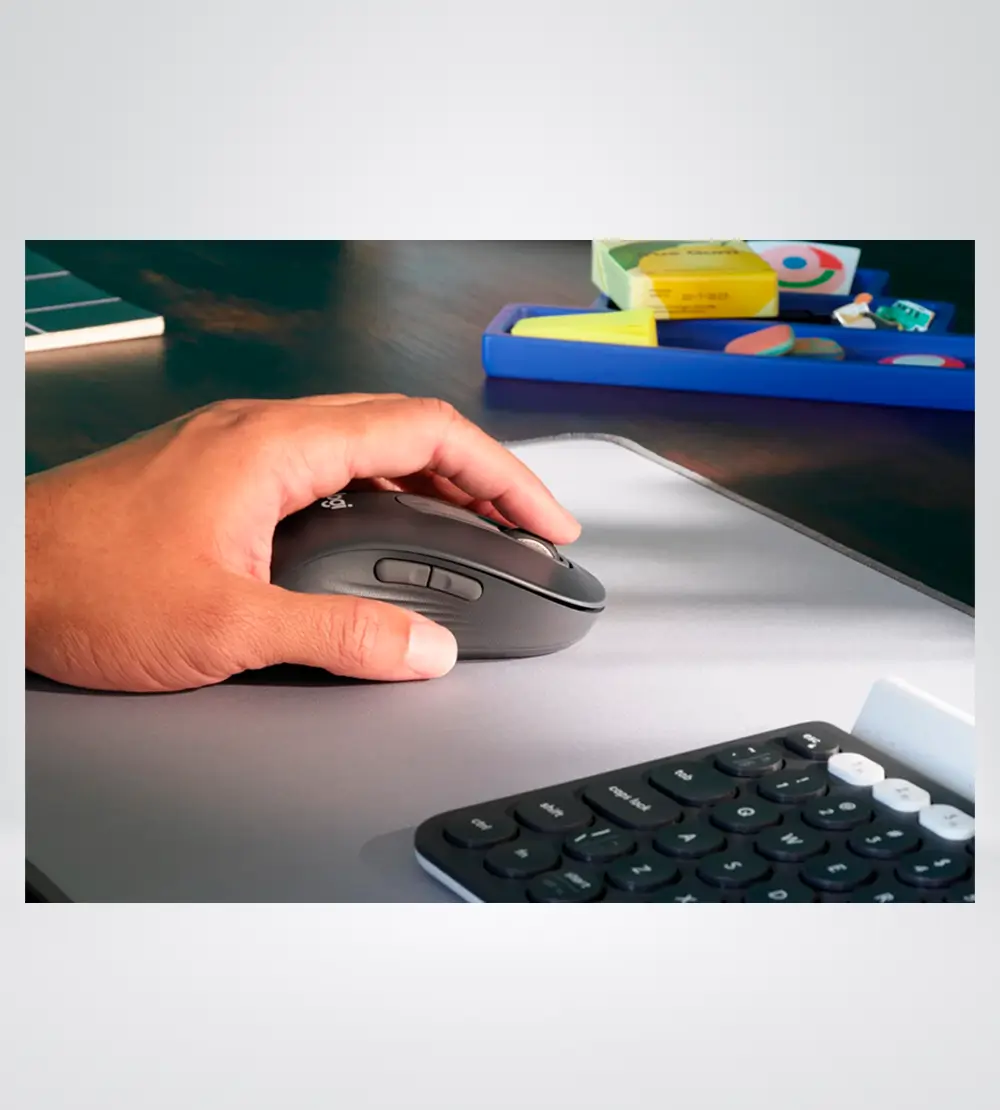 LA OPCIÓN PERFECTA PARA TU MANO. CONFORT MEJORADO gracias a la forma contorneada, un área suave para el pulgar y laterales de goma en cada mouse, la mano se mantiene cómodamente en su sitio. Obtén más confort y concéntrate más en lo que tienes que hacer. CONÉCTATE COMO PREFIERAS Conecta al instante usando Bluetooth de bajo consumo o un receptor USB Logi Bolt. Obtén una conexión inalámbrica estable y confiable a una distancia de hasta 10 metros, funciona en varias plataformas y tiene certificación Works With Chromebook. MENOS RUIDO, MÁS CONCENTRACIÓN Se acabaron los molestos clicks. La tecnología SilentTouch exclusiva de Logitech reduce un 90% de los sonidos de click, creando un entorno mejor y más tranquilo para ti y los que te rodean. BOTONES LATERALES PERSONALIZABLES Personaliza los botones laterales con Logitech Options+, disponible en Windows y macOS, para tus accesos directos favoritos, como retroceder/avanzar o copiar/pegar.