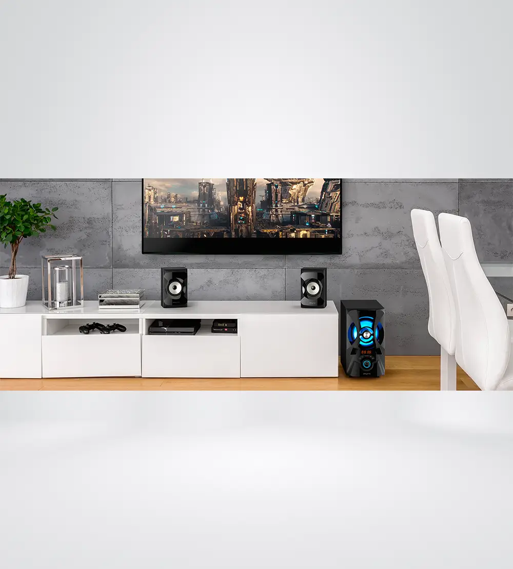Sistema de altavoces 2.1 de alto rendimiento que ofrece audio rico y audaz a través de una amplia gama de opciones de conectividad. ¡Transmita de forma inalámbrica a través de Bluetooth, escuche sus canales de radio FM favoritos o reproduzca directamente desde cualquier dispositivo USB o tarjeta SD! Conectividad por cable auxiliar de 3,5 mm. Salida de potencia Satélites: 2 x 15 W RMS, Salida del subwoofer: 30 W RMS, Pico de potencia: 60W, Potencia total del sistema: Hasta 120 W de RMS.