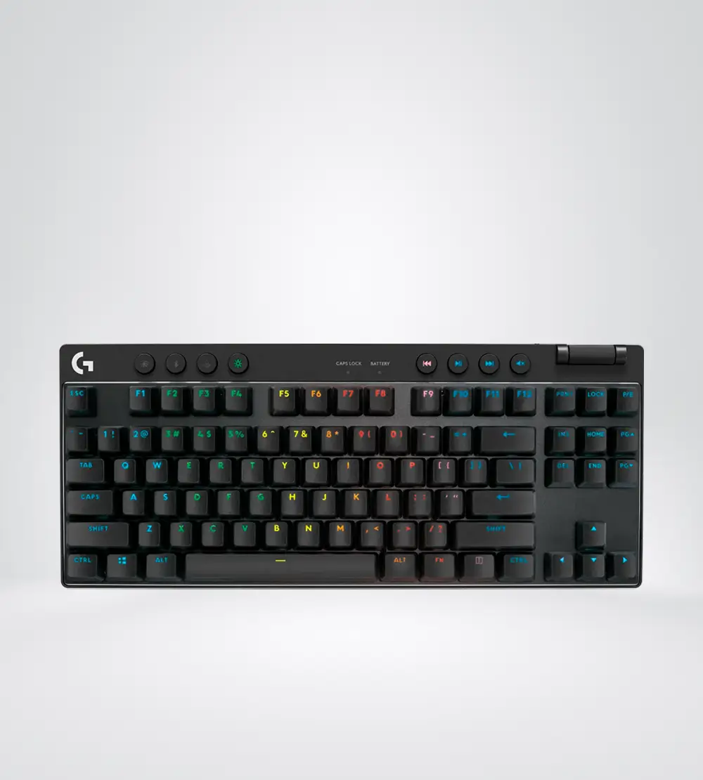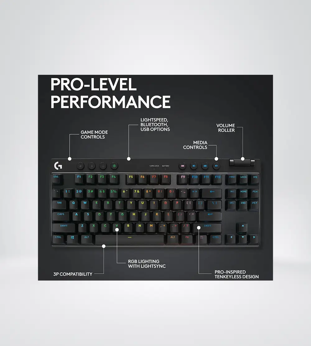 TECNOLOGÍA INALÁMBRICA LIGHTSPEED Desempeño. Velocidad. Confiabilidad. Juega y gana con el desempeño demostrado en torneos de la tecnología inalámbrica LIGHTSPEED y conecta fácilmente tu mouse y teclado compatibles con un solo adaptador. PERSONALIZA Y CONTROLA Con teclas programables, iluminación RGB con LIGHTSYNC, botón de modo de juego y nueva función de bloqueo de modo de juego, además de controles multimedia y rodillo de volumen. PRO X TKL te permite tomar el control en el camino hacia la victoria. DISEÑO Diseñado para que los profesionales ganen campeonatos, con control de modo de juego, teclas de PBT de doble moldeado, distribuciones de teclado estándar para compatibilidad con terceros y opciones de conectividad LIGHTSPEED, Bluetooth y USB.