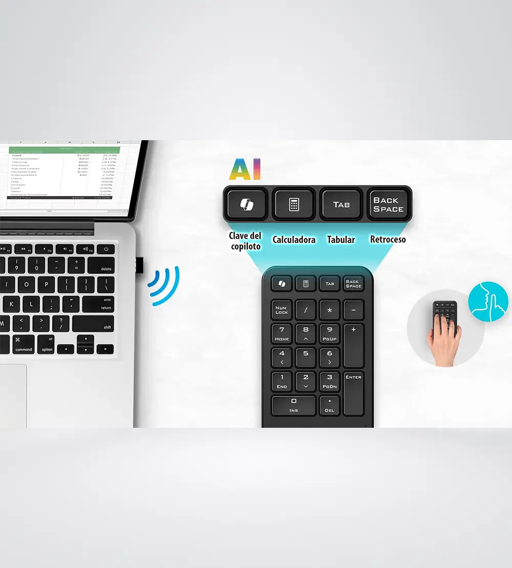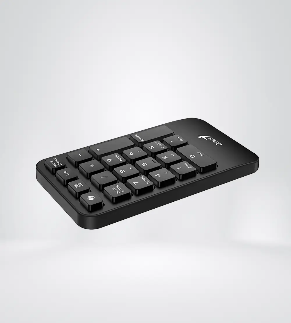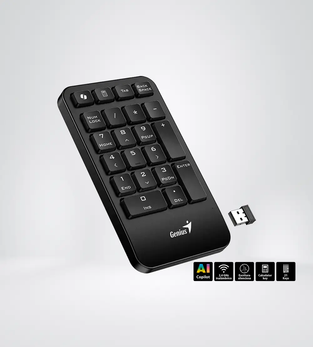 INALÁMBRICO ofrece productividad por su simplicidad Plug & Play con conectividad inalámbrica de 2.4GHz. 21 TECLAS SILENCIOSAS Optimice su flujo de trabajo con precisión y eficiencia. Dentro de las 21 teclas silenciosas incluye lo esencial como NumLock, Calculadora, Tab, Backspace. ERGONOMÍA CON APOYA MUÑECA Diseñado para la comodidad requerido por las personas en constante trabajo numérico. La ergonomía ofrece alivio en la tensión muscular de la muñeca para un rendimiento óptimo. PORTÁTIL Compatible para oficina y hogar, portátil & fácil de utilizar.
