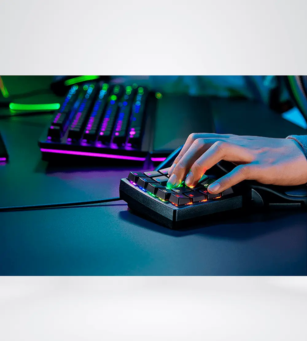INTERRUPTOR ÓPTICO ANALÓGICO RAZER que pueden registrar niveles de entrada escalables en el mismo movimiento, según la distancia que presione. Esto permite una forma de control más mesurada y matizada. ACCIONAMIENTO REGULABLE Los switches admiten un rango de accionamiento de entre 1,5 y 3,6 mm y su sensibilidad puede personalizarse según tus preferencias y tu estilo de juego. TECLAS DE FUNCIÓN DOBLE Un beneficio directo de las pulsaciones incrementales de los switches ópticos analógicos Razer es que ahora puedes vincular dos funciones a cada tecla: una que se activa con una pulsación parcial y otra con una pulsación completa. 32 TECLAS PROGRAMABLES No te quedes nunca sin espacio para tus macros o combinaciones de teclas. LONGITUD DE MACRO ILIMITADA Y 8 PERFILES DE CAMBIO RÁPIDO Consigue que las rotaciones de habilidades y el juego sean más eficientes con la libertad de idear macros avanzadas, y prepara la configuración perfecta para cualquier encuentro de nivel con una colección de perfiles almacenados.