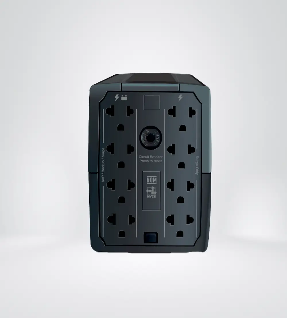 UPS interactivo de línea de 1000VA con 8 toma corrientes NEMA 5-15 diseñados para el hogar / oficina. Baterías de plomo Acido selladas internas, regulador de voltaje supresor de sobre tensiones y salidas de derivación para cargas más grandes. Proporciona energía continua a enrutadores WIFI, sistemas de alarma y equipos informáticos. Las alarmas audibles indican el funcionamiento y los niveles de batería. Certificado por las agencias reguladoras NOM, ISO9001-2015, ISO14001, RETIE.